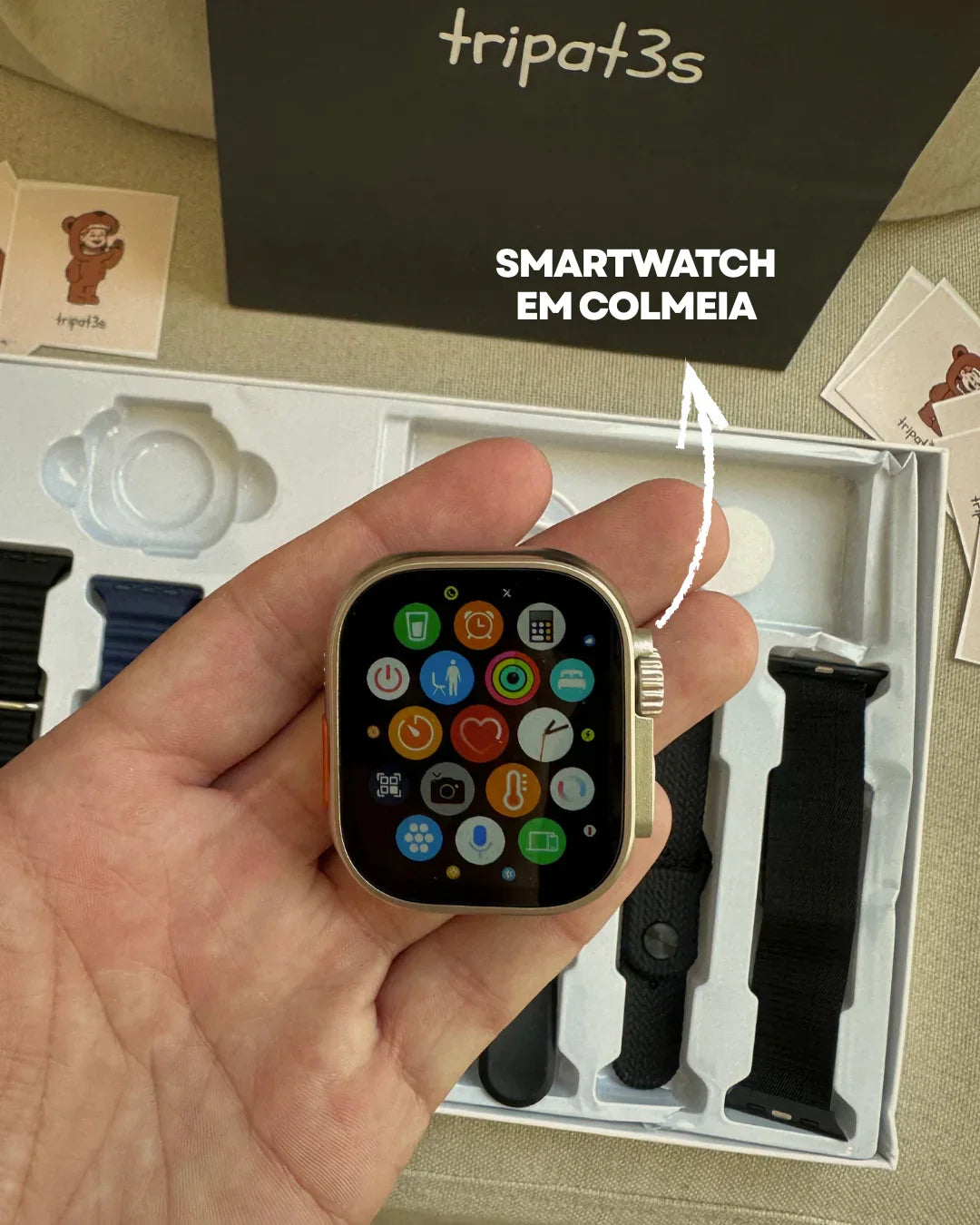 Inclui SmartWatch Série 8, carregador e 7 braceletes de cores e texturas diferentes.